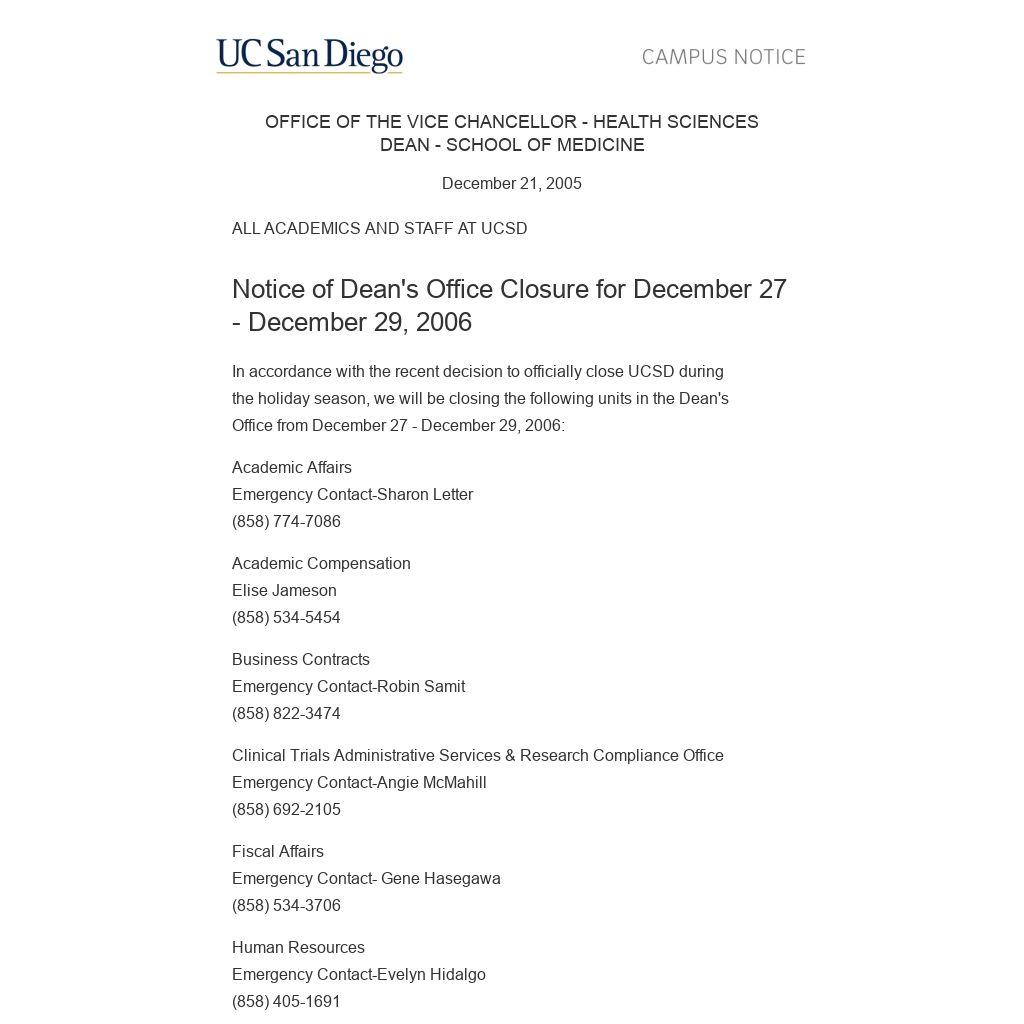 In accordance with the recent decision to officially close UCSD during