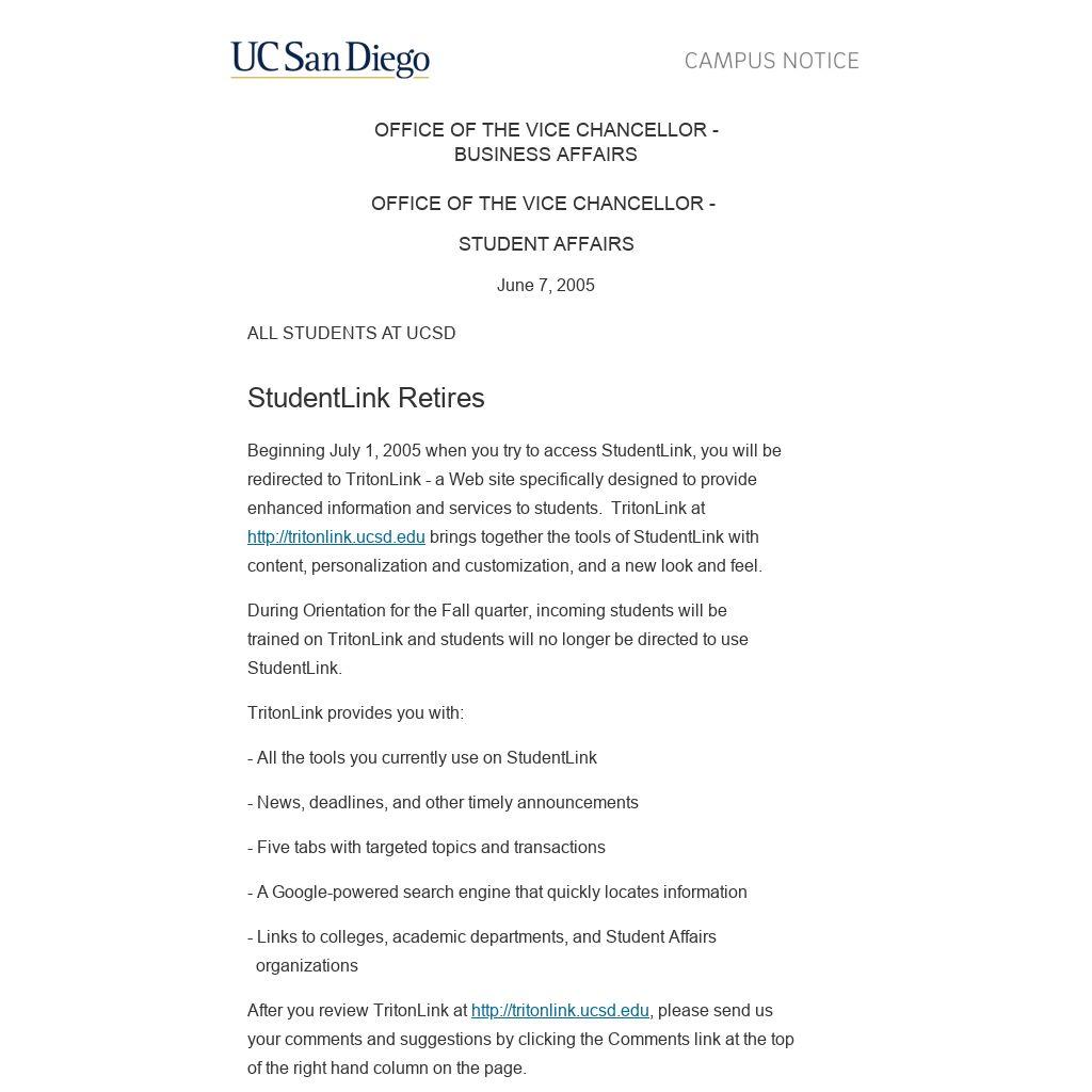 After you review TritonLink at http://tritonlink.ucsd.edu, please send us