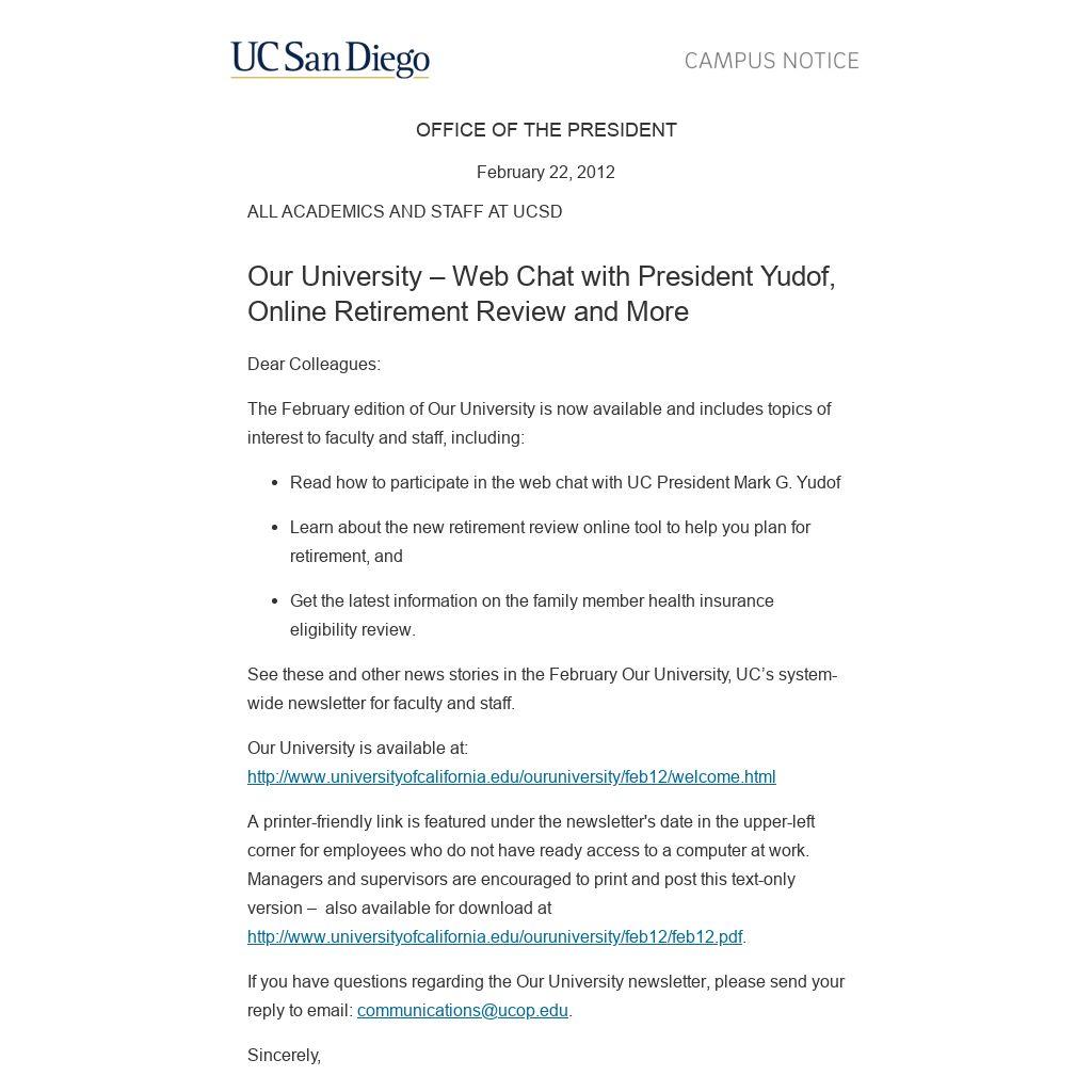 A printer-friendly link is featured under the newsletter's date in the upper-left corner for employees who do not have ready access to a computer at work. Managers and supervisors are encouraged to print and post this text-only version – also available for download at http://www.universityofcalifornia.edu/ouruniversity/feb12/feb12.pdf.