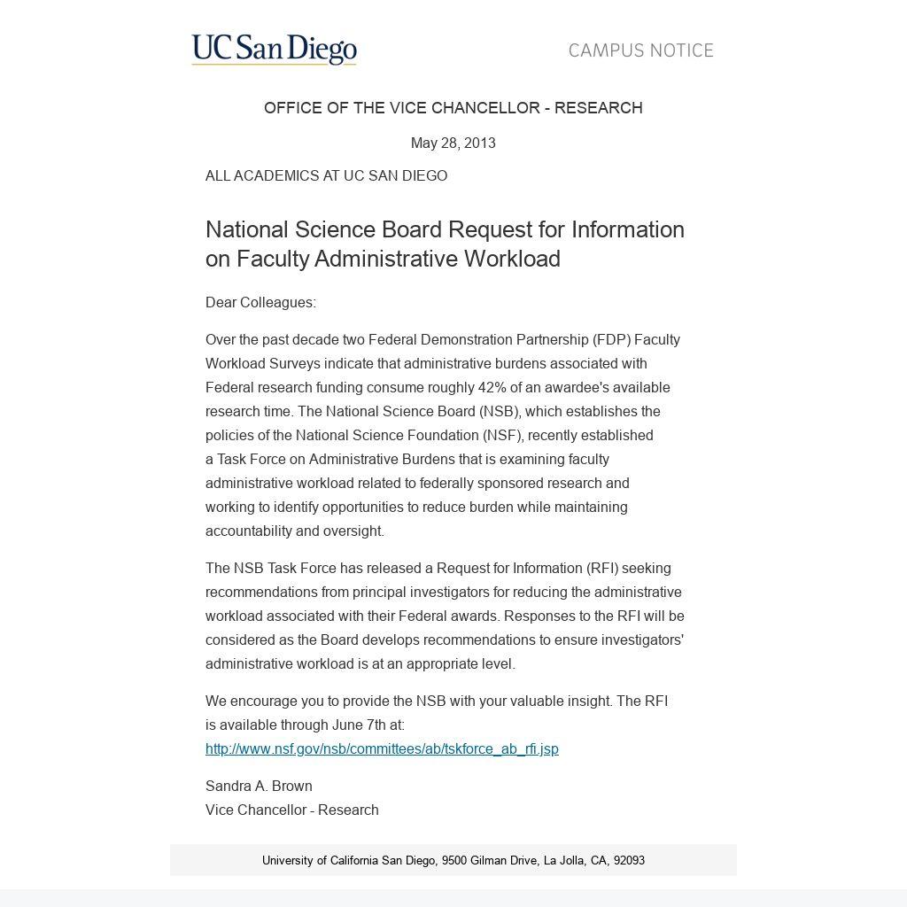 recommendations from principal investigators for reducing the administrative workload associated with their Federal awards. Responses to the RFI will be considered as the Board develops recommendations to ensure investigators' administrative workload is at an appropriate level.