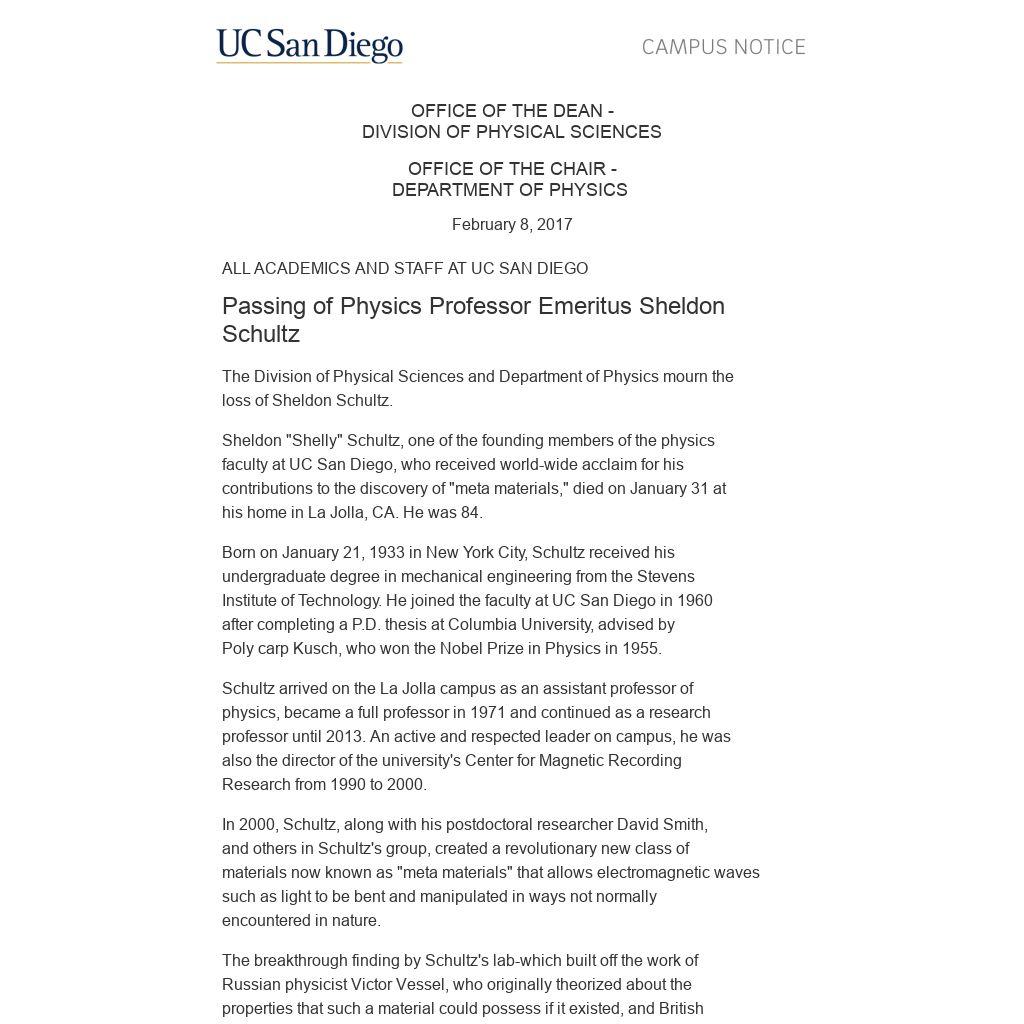 Sheldon "Shelly" Schultz, one of the founding members of the physics