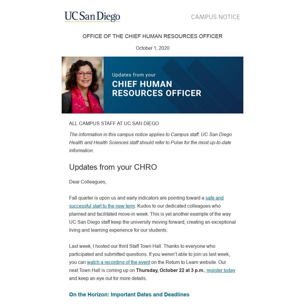 The information in this campus notice applies to Campus staff. UC San Diego Health and Health Sciences staff should refer to Pulse for the most up-to-date information.