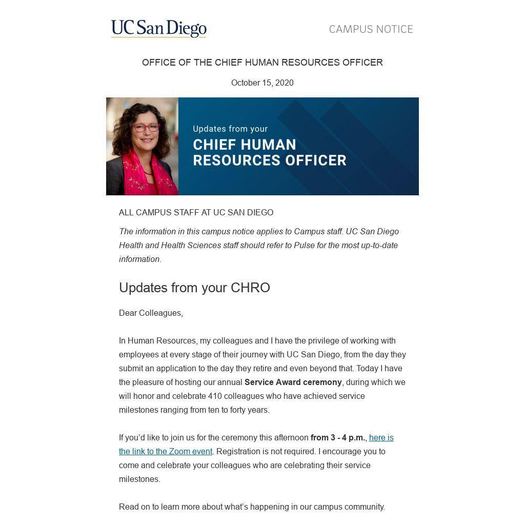 The information in this campus notice applies to Campus staff. UC San Diego Health and Health Sciences staff should refer to Pulse for the most up-to-date information.