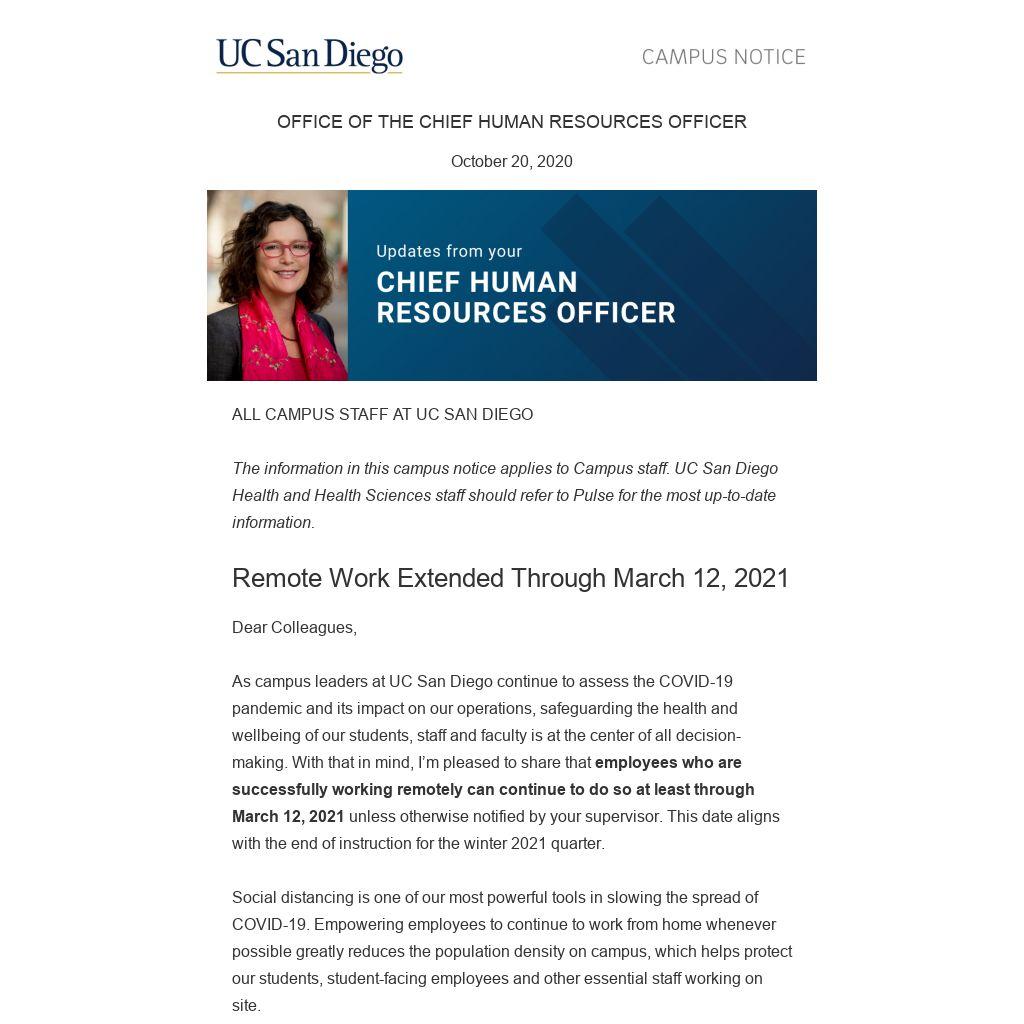 As campus leaders at UC San Diego continue to assess the COVID-19 pandemic and its impact on our operations, safeguarding the health and wellbeing of our students, staff and faculty is at the center of all decision-making. With that in mind, Chancellor Khosla has authorized me to share that employees who are successfully working remotely can continue to do so at least through March 12, 2021 unless otherwise notified by your supervisor. This date aligns with the end of instruction for the winter 2021 quarter.