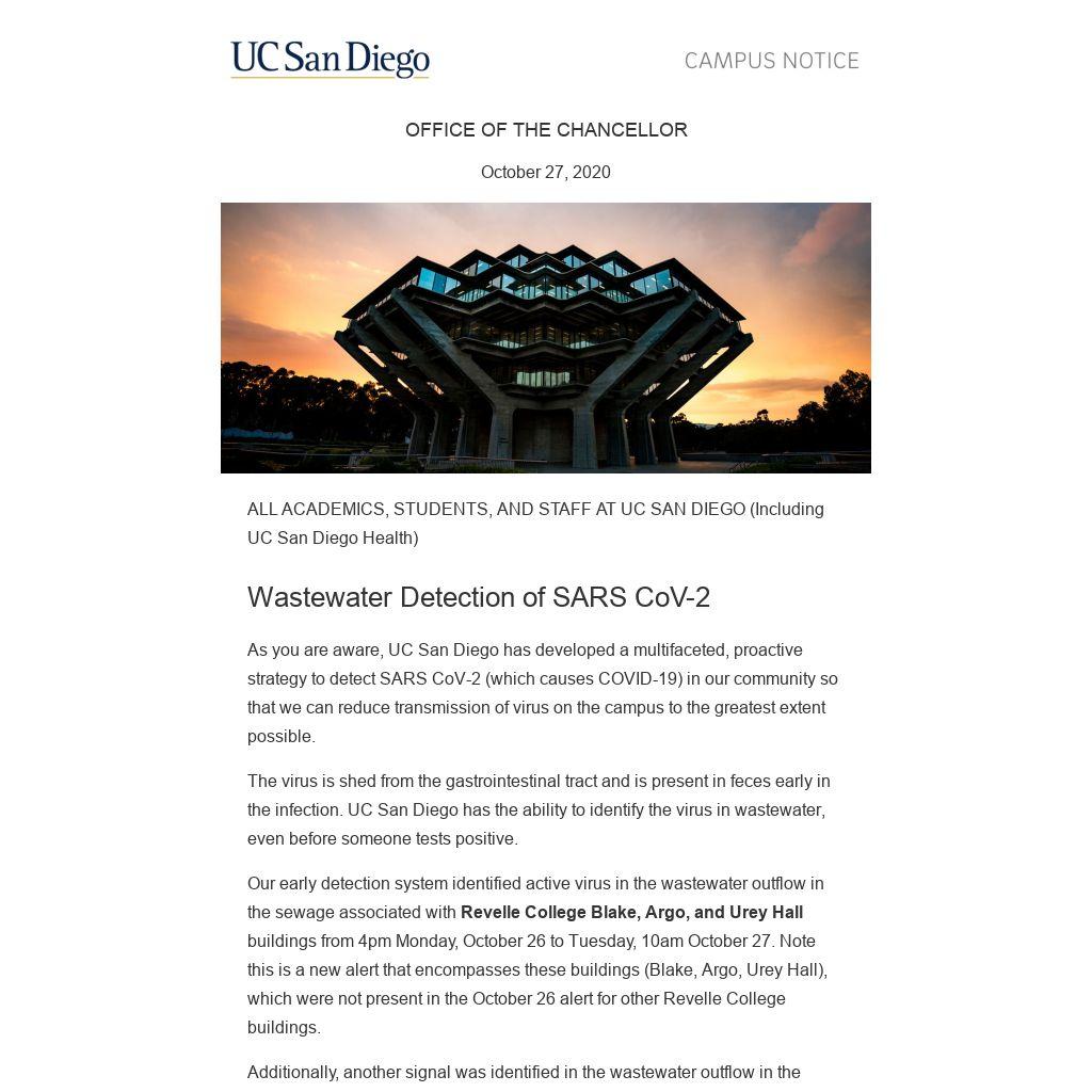 Our early detection system identified active virus in the wastewater outflow in the sewage associated with Revelle College Blake, Argo, and Urey Hall buildings from 4pm Monday, October 26 to Tuesday, 10am October 27. Note this is a new alert that encompasses these buildings (Blake, Argo, Urey Hall), which were not present in the October 26 alert for other Revelle College buildings.