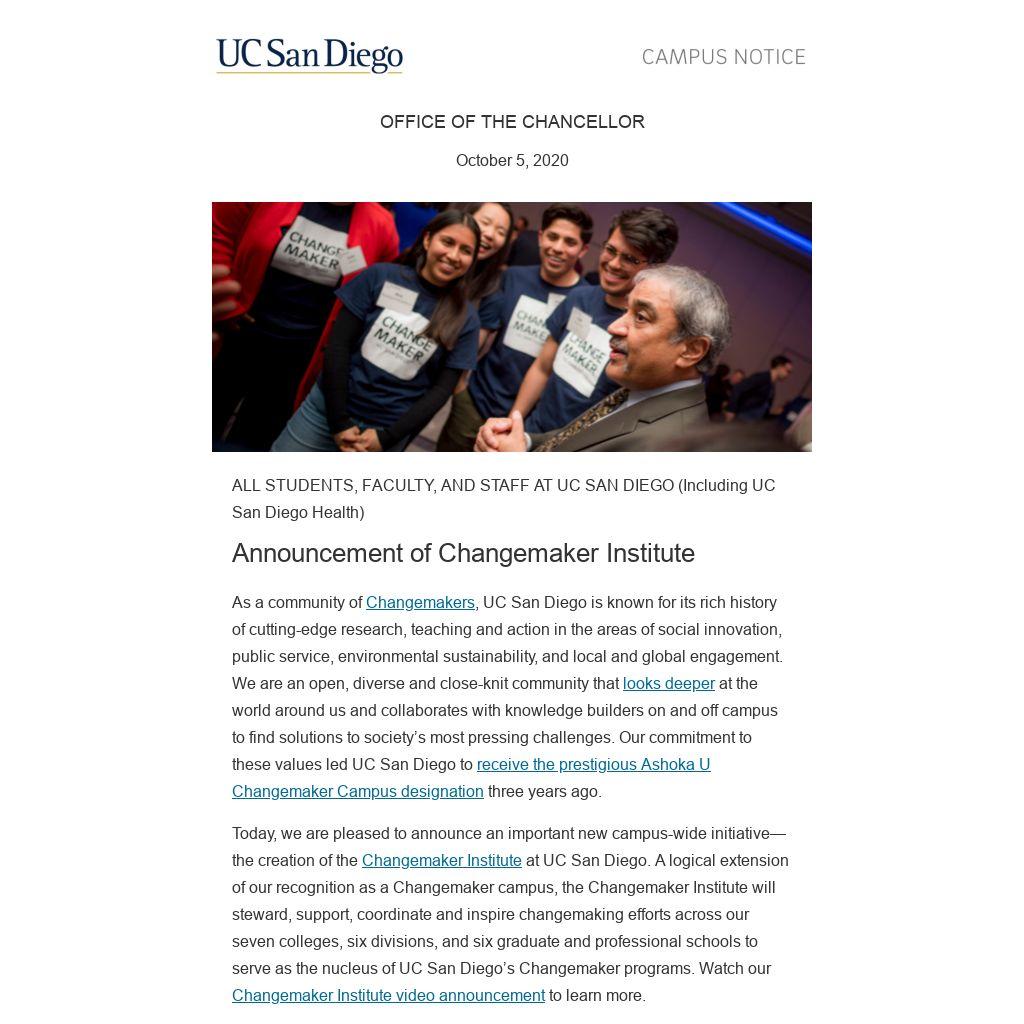 Today, we are pleased to announce an important new campus-wide initiative—the creation of the Changemaker Institute at UC San Diego. A logical extension of our recognition as a Changemaker campus, the Changemaker Institute will steward, support, coordinate and inspire changemaking efforts across our seven colleges, six divisions, and six graduate and professional schools to serve as the nucleus of UC San Diego’s Changemaker programs. Watch our Changemaker Institute video announcement to learn more.