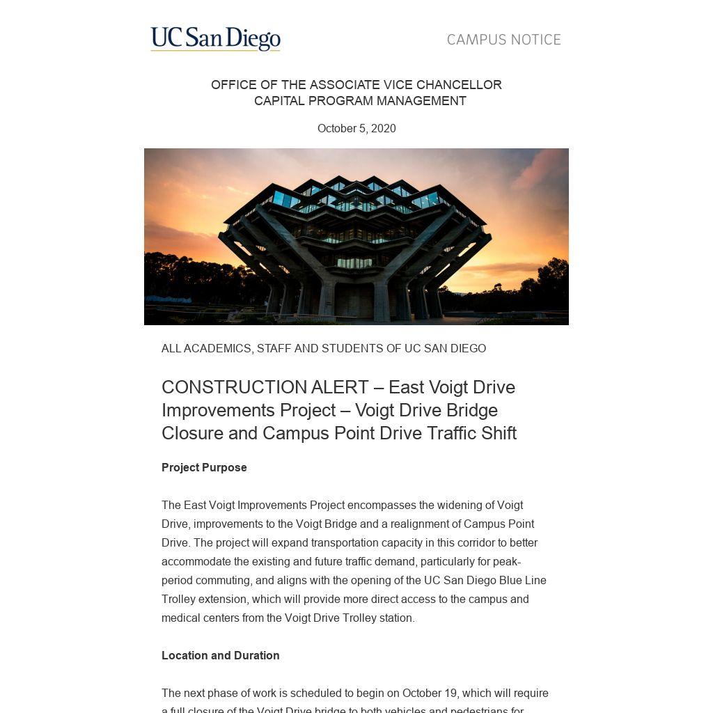 The next phase of work is scheduled to begin on October 19, which will require a full closure of the Voigt Drive bridge to both vehicles and pedestrians for approximately five months, and will also shift the existing southbound/inbound Campus Point Drive traffic onto the new roadway alignment. Road closures are necessary to expedite project work, lessen the overall impact and ensure public safety.