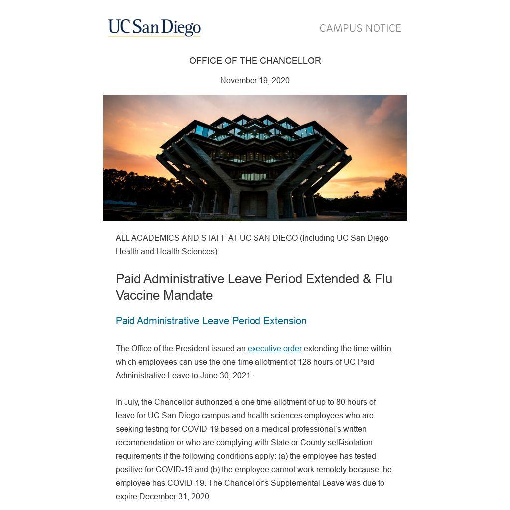 In July, the Chancellor authorized a one-time allotment of up to 80 hours of leave for UC San Diego campus and health sciences employees who are seeking testing for COVID-19 based on a medical professional’s written recommendation or who are complying with State or County self-isolation requirements if the following conditions apply: (a) the employee has tested positive for COVID-19 and (b) the employee cannot work remotely because the employee has COVID-19. The Chancellor’s Supplemental Leave was due to expire December 31, 2020.