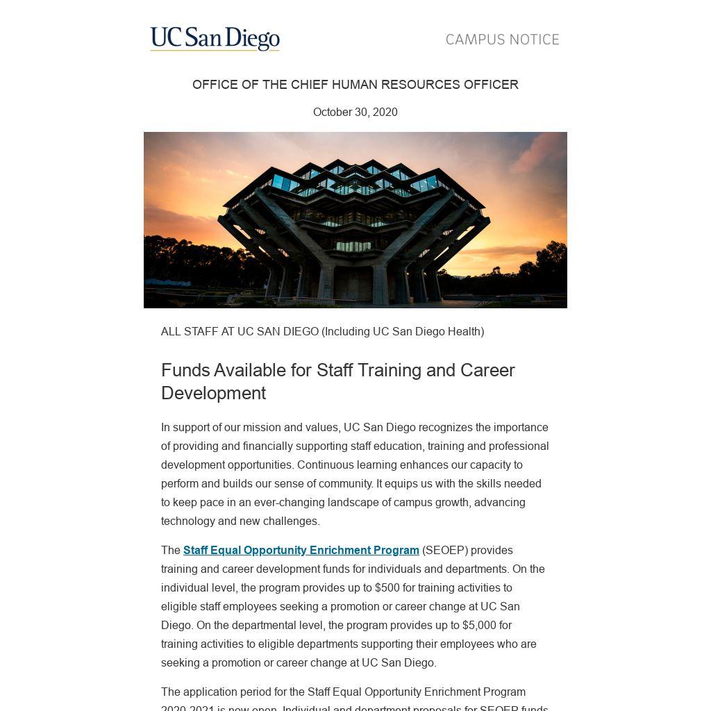 The Staff Equal Opportunity Enrichment Program (SEOEP) provides training and career development funds for individuals and departments. On the individual level, the program provides up to $500 for training activities to eligible staff employees seeking a promotion or career change at UC San Diego. On the departmental level, the program provides up to $5,000 for training activities to eligible departments supporting their employees who are seeking a promotion or career change at UC San Diego.