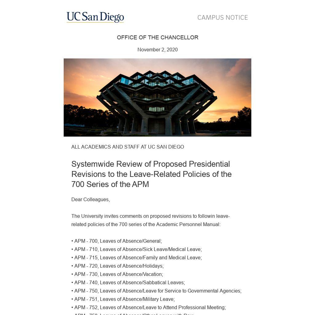 This policy applies to all persons at all UC San Diego locations. Under the Regents’ Policy, campuses were directed to issue implementing rules for certain policy requirements. This proposed policy constitutes the implementing rules for the San Diego campus and is available for viewing here. This is a formal review of the proposed Implementing Rules. If you have comments for submission in response to the policy review, please provide your written comments to Heather Zion in Academic Personnel Services at hzion@ucsd.edu no later than January 8, 2021.