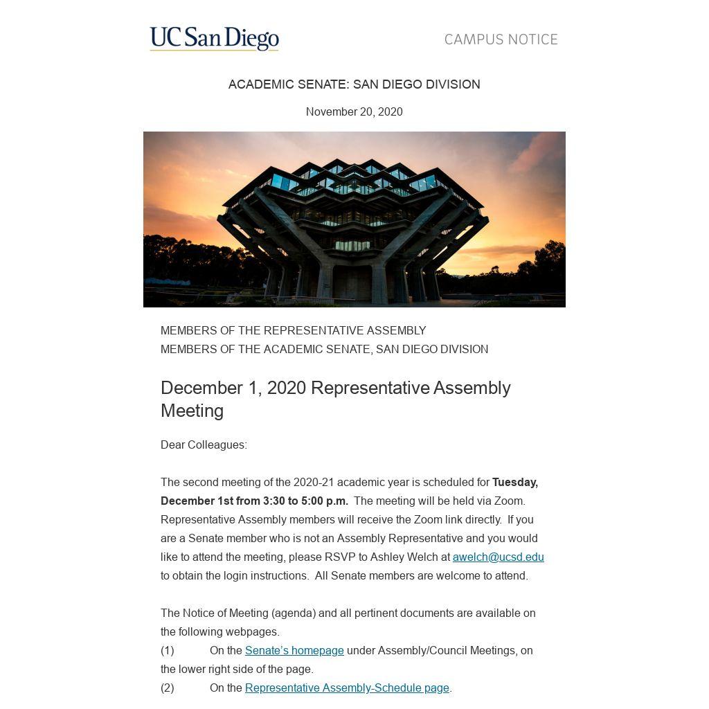 The second meeting of the 2020-21 academic year is scheduled for Tuesday, December 1st from 3:30 to 5:00 p.m. The meeting will be held via Zoom. Representative Assembly members will receive the Zoom link directly. If you are a Senate member who is not an Assembly Representative and you would like to attend the meeting, please RSVP to Ashley Welch at awelch@ucsd.edu to obtain the login instructions. All Senate members are welcome to attend.