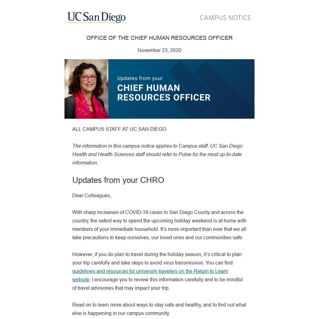 The information in this campus notice applies to Campus staff. UC San Diego Health and Health Sciences staff should refer to Pulse for the most up-to-date information.