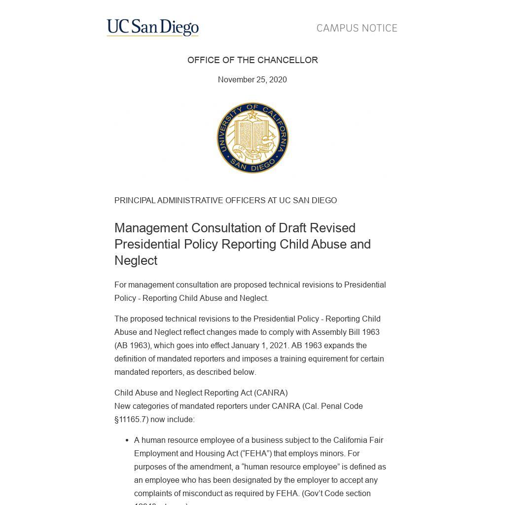 The proposed technical revisions to the Presidential Policy - Reporting Child Abuse and Neglect reflect changes made to comply with Assembly Bill 1963 (AB 1963), which goes into effect January 1, 2021. AB 1963 expands the definition of mandated reporters and imposes a training equirement for certain mandated reporters, as described below.