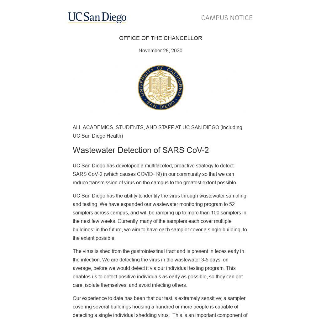 Thousands of people are on the UC San Diego campus every day, including members of the public. This test is an early indication that one or more individuals are shedding the virus; note that viral shedding starts before symptoms develop and is also present in people who never develop symptoms.