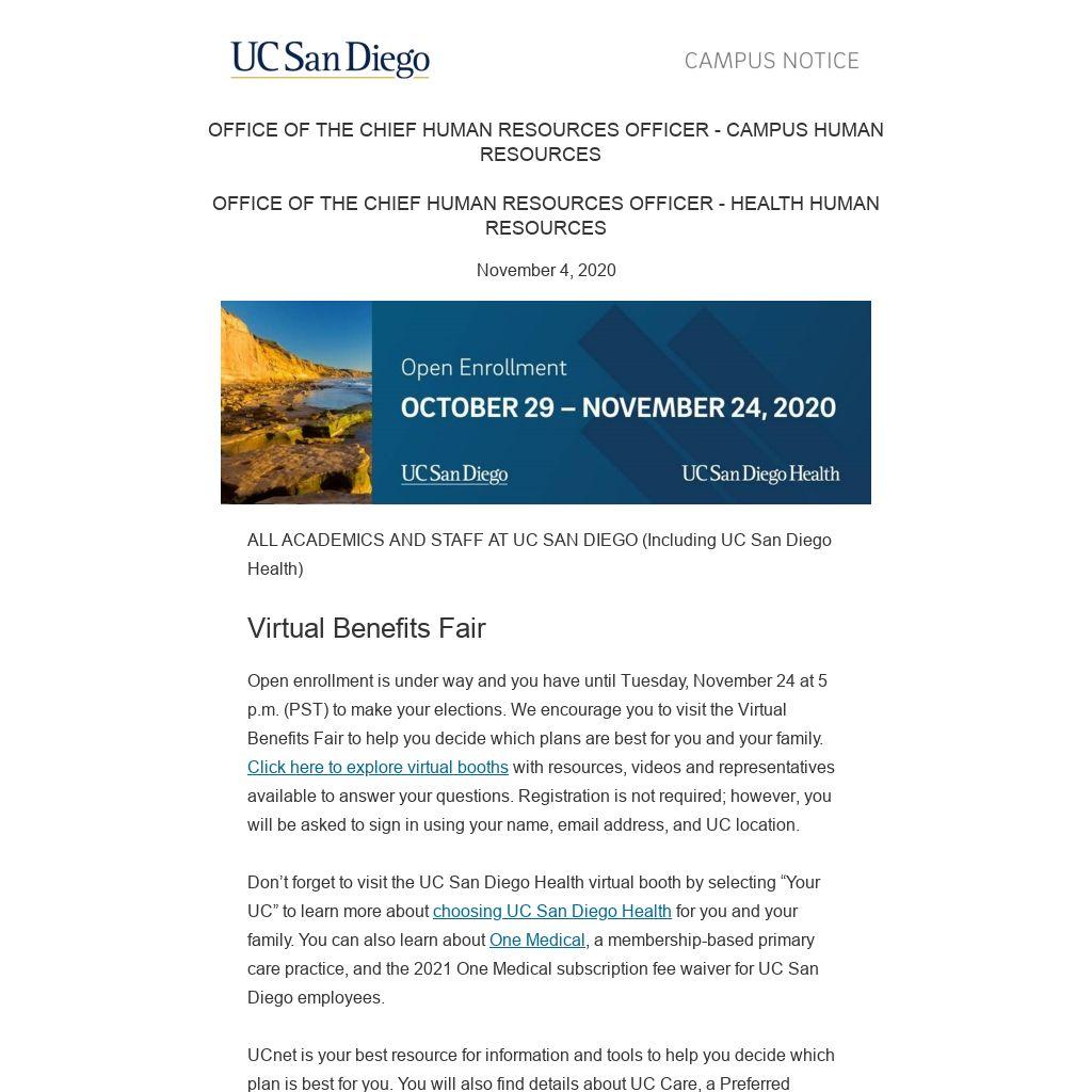 Open enrollment is under way and you have until Tuesday, November 24 at 5 p.m. (PST) to make your elections. We encourage you to visit the Virtual Benefits Fair to help you decide which plans are best for you and your family. Click here to explore virtual booths with resources, videos and representatives available to answer your questions. Registration is not required; however, you will be asked to sign in using your name, email address, and UC location.