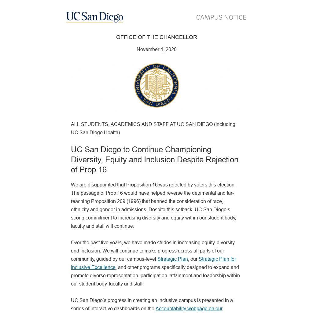 We are disappointed that Proposition 16 was rejected by voters this election. The passage of Prop 16 would have helped reverse the detrimental and far-reaching Proposition 209 (1996) that banned the consideration of race, ethnicity and gender in admissions. Despite this setback, UC San Diego’s strong commitment to increasing diversity and equity within our student body, faculty and staff will continue.