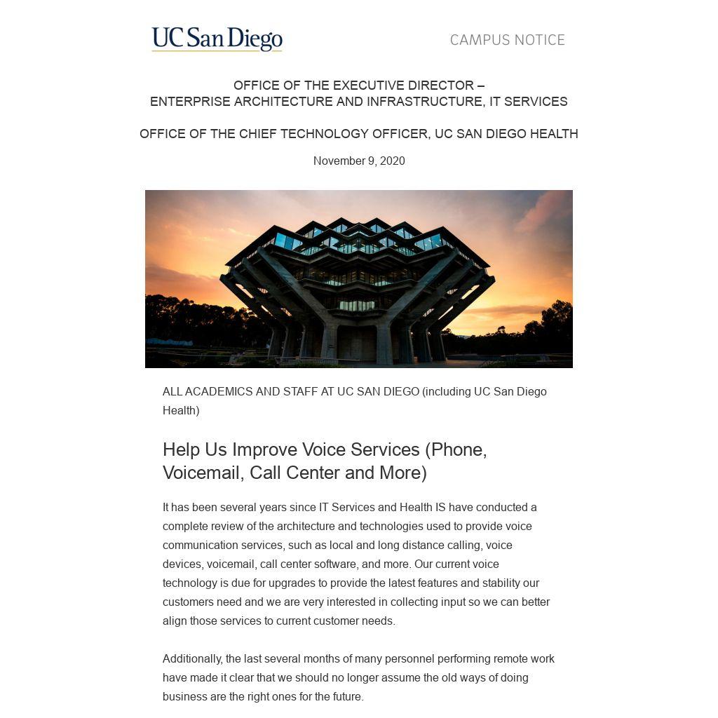 We want to hear from you, our customers, to let us know what is important to you about our services, what is missing, what needs to improve, and what we should leave unchanged. It is only with this feedback that we can provide you the world-class voice services you need to fulfill the university's mission.