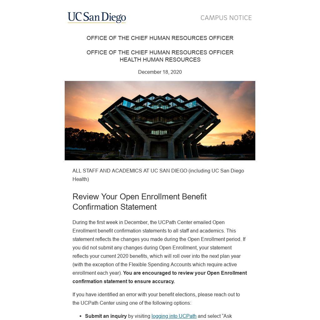 During the first week in December, the UCPath Center emailed Open Enrollment benefit confirmation statements to all staff and academics. This statement reflects the changes you made during the Open Enrollment period. If you did not submit any changes during Open Enrollment, your statement reflects your current 2020 benefits, which will roll over into the next plan year (with the exception of the Flexible Spending Accounts which require active enrollment each year). You are encouraged to review your Open Enrollment confirmation statement to ensure accuracy.