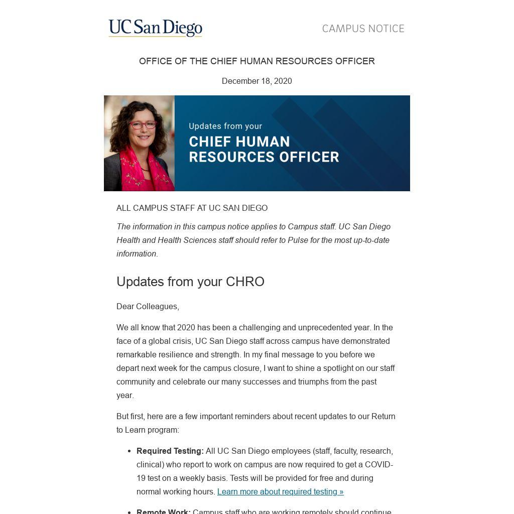On behalf of your Human Resources organization, I send you warm wishes for a wonderful holiday season. Thank you for all you do for UC San Diego, and I look forward to continuing our work together in 2021.