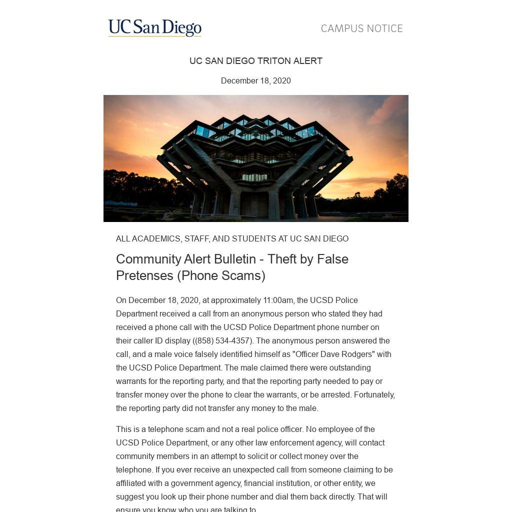On December 18, 2020, at approximately 11:00am, the UCSD Police Department received a call from an anonymous person who stated they had received a phone call with the UCSD Police Department phone number on their caller ID display ((858) 534-4357). The anonymous person answered the call, and a male voice falsely identified himself as "Officer Dave Rodgers" with the UCSD Police Department. The male claimed there were outstanding warrants for the reporting party, and that the reporting party needed to pay or transfer money over the phone to clear the warrants, or be arrested. Fortunately, the reporting party did not transfer any money to the male.