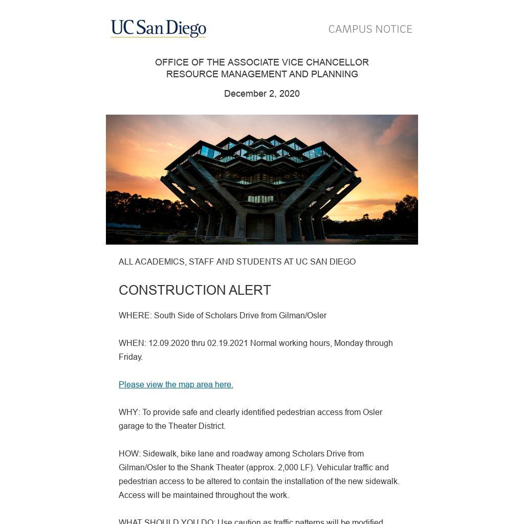 HOW: Sidewalk, bike lane and roadway among Scholars Drive from Gilman/Osler to the Shank Theater (approx. 2,000 LF). Vehicular traffic and pedestrian access to be altered to contain the installation of the new sidewalk. Access will be maintained throughout the work.