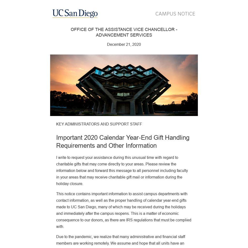 This notice contains important information to assist campus departments with contact information, as well as the proper handling of calendar year-end gifts made to UC San Diego, many of which may be received during the holidays and immediately after the campus reopens. This is a matter of economic consequence to our donors, as there are IRS regulations that must be complied with.