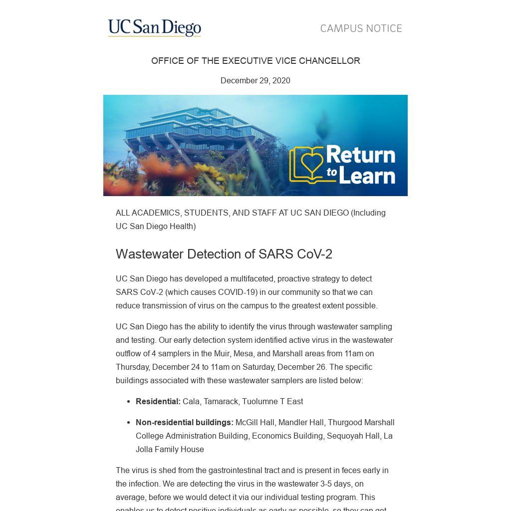UC San Diego has the ability to identify the virus through wastewater sampling and testing. Our early detection system identified active virus in the wastewater outflow of 4 samplers in the Muir, Mesa, and Marshall areas from 11am on Thursday, December 24 to 11am on Saturday, December 26. The specific buildings associated with these wastewater samplers are listed below:
