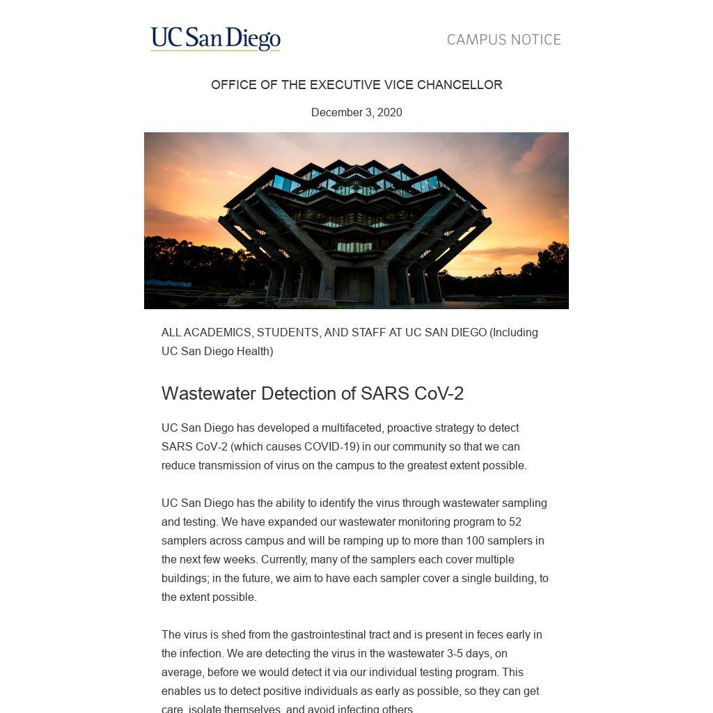 UC San Diego has the ability to identify the virus through wastewater sampling and testing. We have expanded our wastewater monitoring program to 52 samplers across campus and will be ramping up to more than 100 samplers in the next few weeks. Currently, many of the samplers each cover multiple buildings; in the future, we aim to have each sampler cover a single building, to the extent possible.