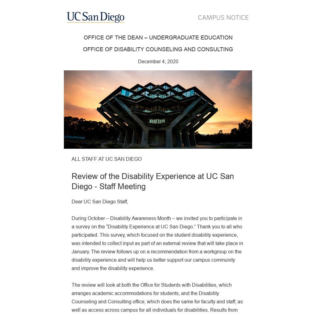 During October – Disability Awareness Month – we invited you to participate in a survey on the “Disability Experience at UC San Diego.” Thank you to all who participated. This survey, which focused on the student disability experience, was intended to collect input as part of an external review that will take place in January. The review follows up on a recommendation from a workgroup on the disability experience and will help us better support our campus community and improve the disability experience.