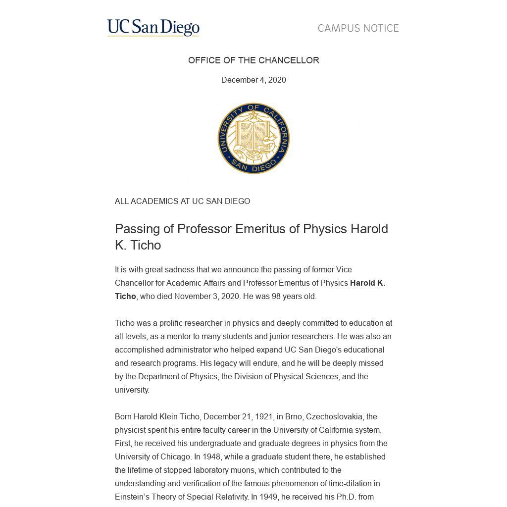It is with great sadness that we announce the passing of former Vice Chancellor for Academic Affairs and Professor Emeritus of Physics Harold K. Ticho, who died November 3, 2020. He was 98 years old.