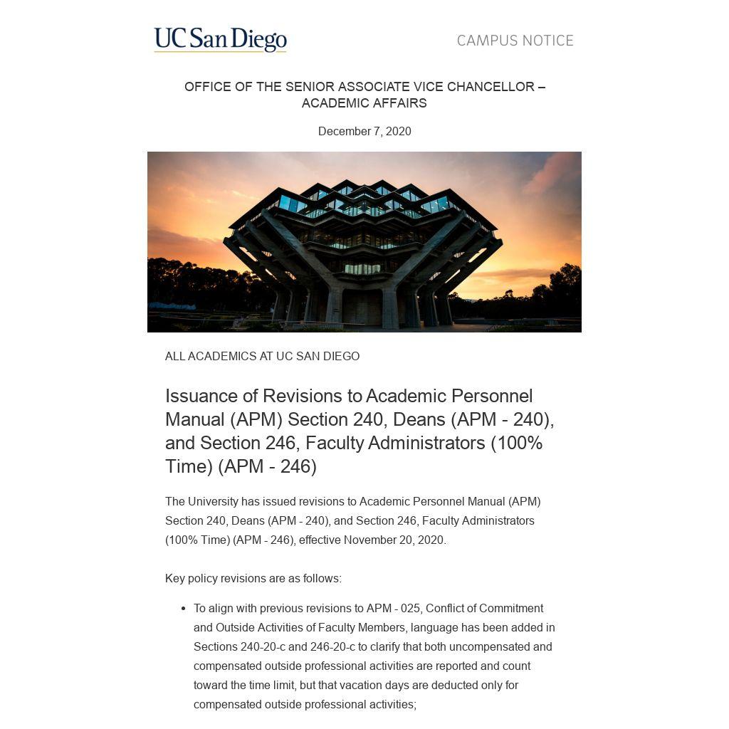 The University has issued revisions to Academic Personnel Manual (APM) Section 240, Deans (APM - 240), and Section 246, Faculty Administrators (100% Time) (APM - 246), effective November 20, 2020.