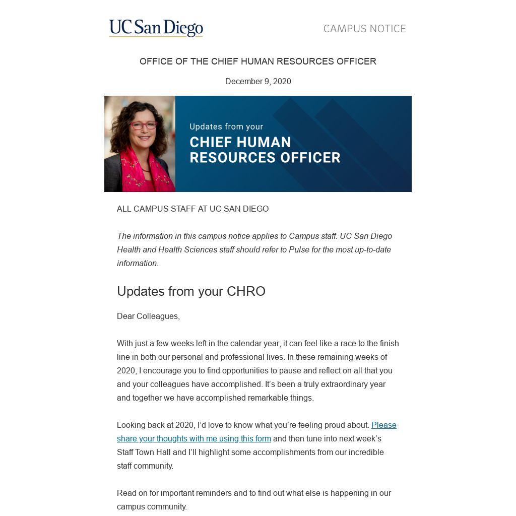 The information in this campus notice applies to Campus staff. UC San Diego Health and Health Sciences staff should refer to Pulse for the most up-to-date information.