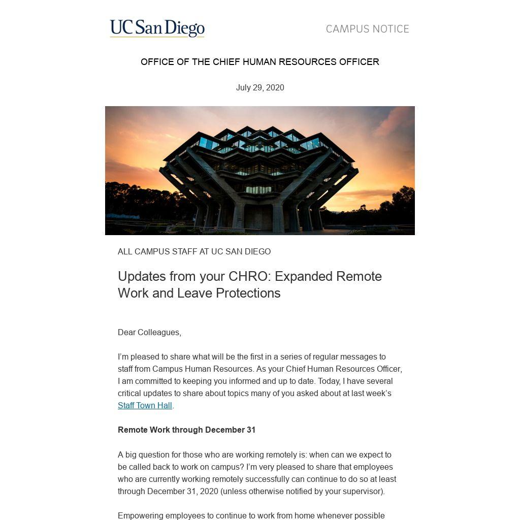 I am also very happy to share details about a new leave provision for UC San Diego employees: Chancellor Supplemental Leave. I’d like to extend my gratitude to Chancellor Khosla for endorsing this important new leave provision, which reflects our institutional commitment to supporting UC San Diego employees and contributing to the greater public health effort.