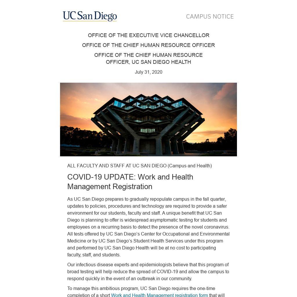 As UC San Diego prepares to gradually repopulate campus in the fall quarter, updates to policies, procedures and technology are required to provide a safer environment for our students, faculty and staff. A unique benefit that UC San Diego is planning to offer is widespread asymptomatic testing for students and employees on a recurring basis to detect the presence of the novel coronavirus. All tests offered by UC San Diego’s Center for Occupational and Environmental Medicine or by UC San Diego’s Student Health Services under this program and performed by UC San Diego Health will be at no cost to participating faculty, staff, and students.