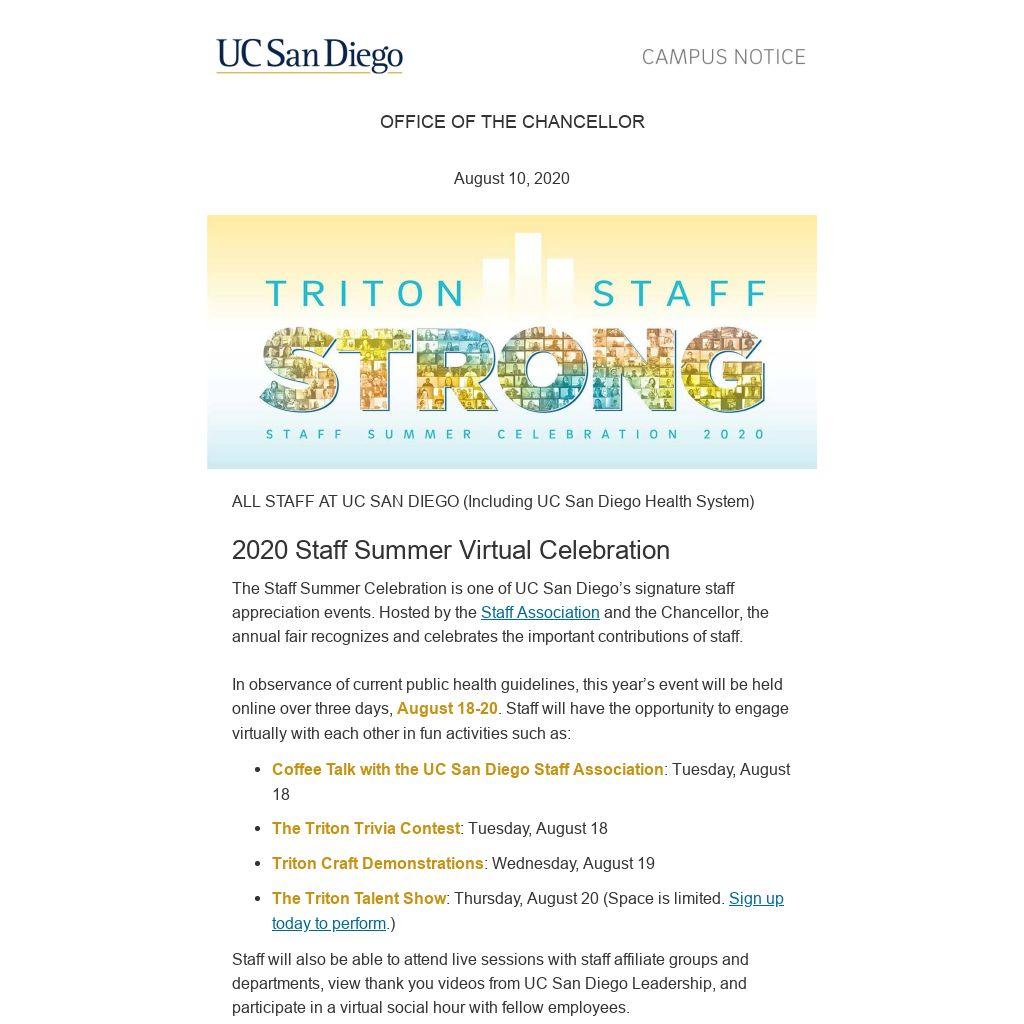 Staff will also be able to attend live sessions with staff affiliate groups and departments, view thank you videos from UC San Diego Leadership, and participate in a virtual social hour with fellow employees.