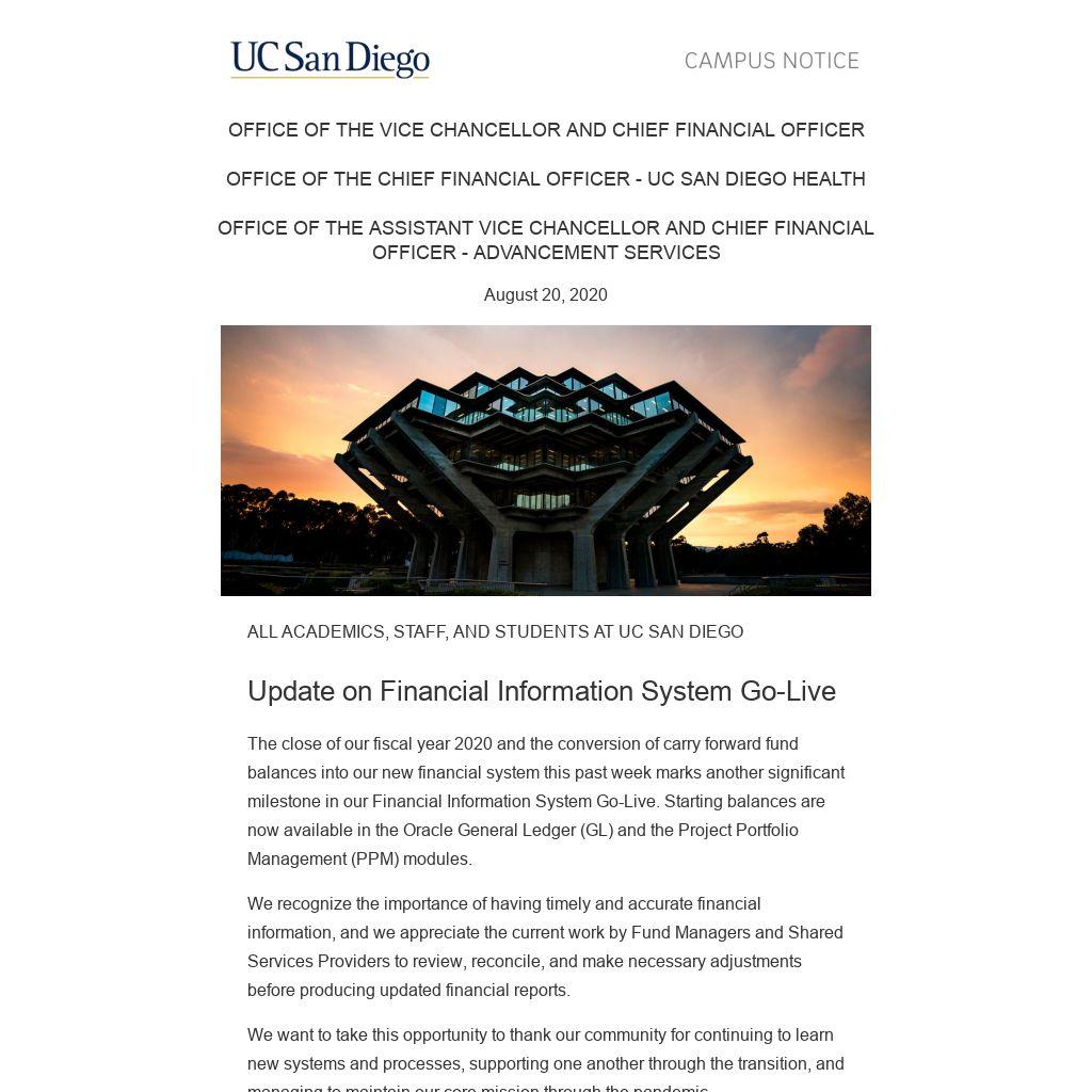 The close of our fiscal year 2020 and the conversion of carry forward fund balances into our new financial system this past week marks another significant milestone in our Financial Information System Go-Live. Starting balances are now available in the Oracle General Ledger (GL) and the Project Portfolio Management (PPM) modules.