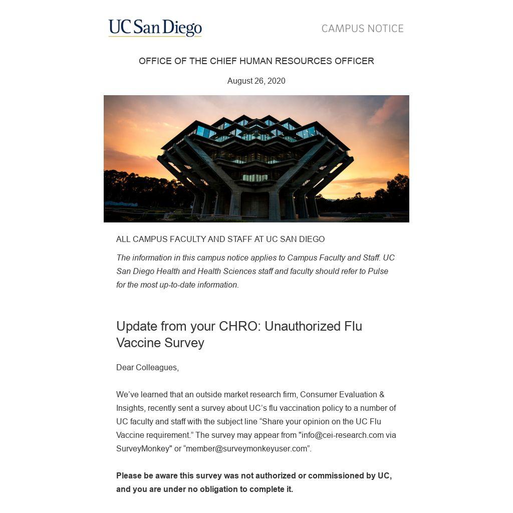 We’ve learned that an outside market research firm, Consumer Evaluation & Insights, recently sent a survey about UC’s flu vaccination policy to a number of UC faculty and staff with the subject line “Share your opinion on the UC Flu Vaccine requirement.” The survey may appear from "info@cei-research.com via SurveyMonkey" or “member@surveymonkeyuser.com”.