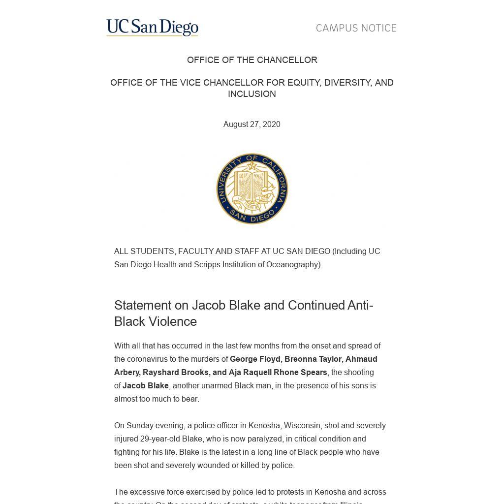 It is important to restate that the University of California San Diego unequivocally condemns the disproportionate use of excessive force by police in communities of color. We also denounce vigilante acts that terrorize members of the community based upon race, ethnicity, country of origin, immigration status, religion, disability, gender, gender identity, or sexual orientation. We as a community must not and will not tolerate acts of hate, bias or violence.