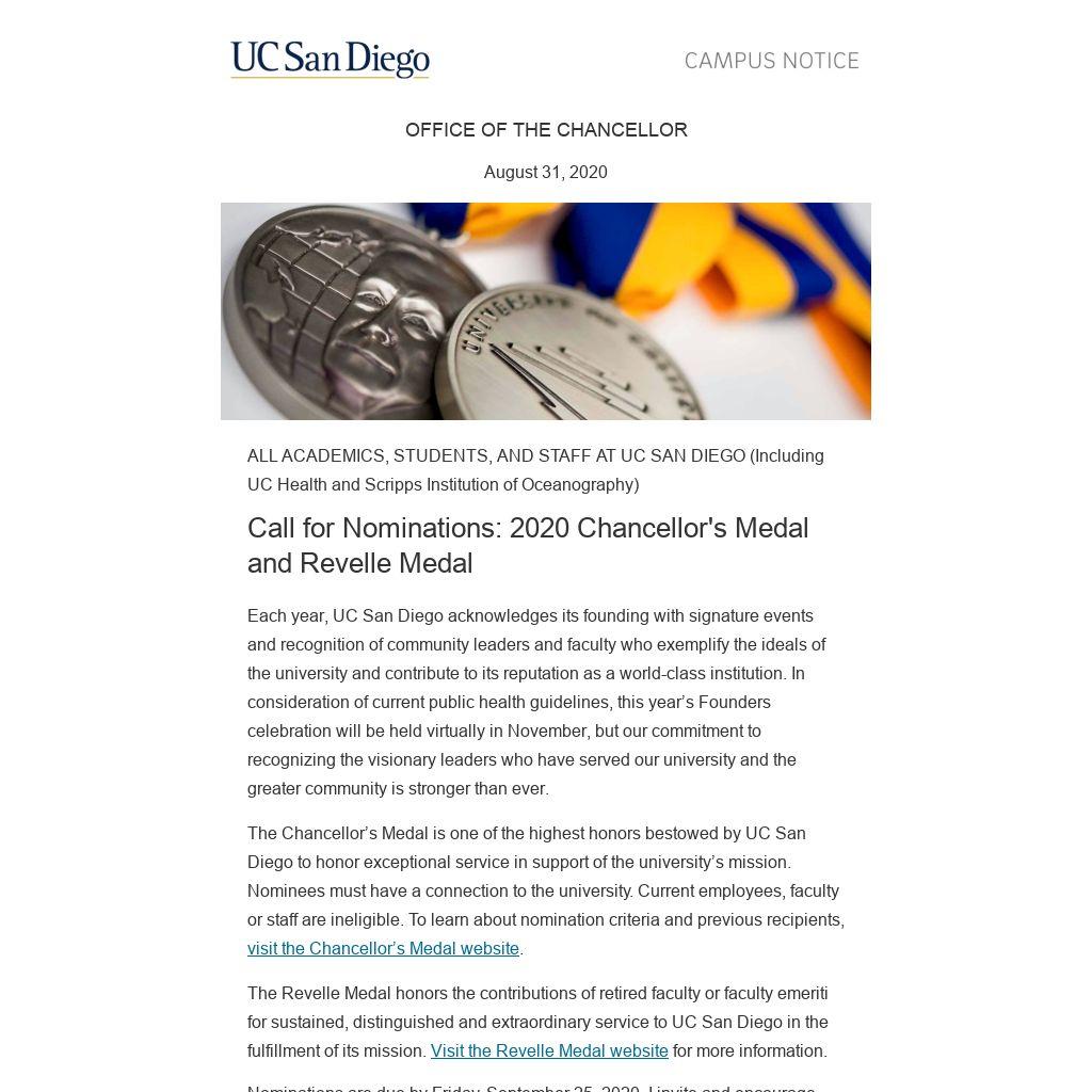 Nominations are due by Friday, September 25, 2020. I invite and encourage each of you to submit your nomination of those extraordinary leaders who are driving UC San Diego’s stature as a leading university and health system. Thank you for your contribution to the process.