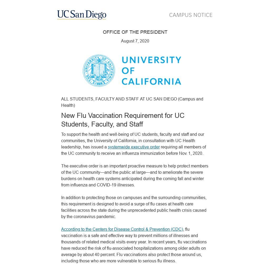To support the health and well-being of UC students, faculty and staff and our communities, the University of California, in consultation with UC Health leadership, has issued a systemwide executive order requiring all members of the UC community to receive an influenza immunization before Nov. 1, 2020.