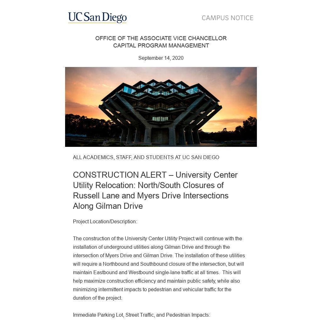 The construction of the University Center Utility Project will continue with the installation of underground utilities along Gilman Drive and through the intersection of Myers Drive and Gilman Drive. The installation of these utilities will require a Northbound and Southbound closure of the intersection, but will maintain Eastbound and Westbound single-lane traffic at all times. This will help maximize construction efficiency and maintain public safety, while also minimizing intermittent impacts to pedestrian and vehicular traffic for the duration of the project.
