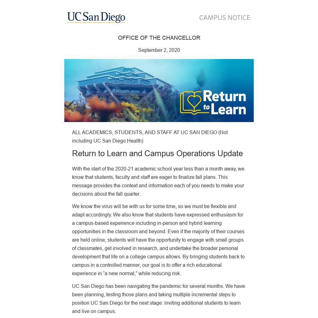 Recent reports about college campuses around the country that have suffered significant outbreaks of COVID-19 have been troubling. I want to assure our entire UC San Diego community that we have taken tremendous care both in planning and in practicing for your return to campus. Our strategies to mitigate risk, detect the virus and intervene when positive cases occurred during the spring and summer were successful.