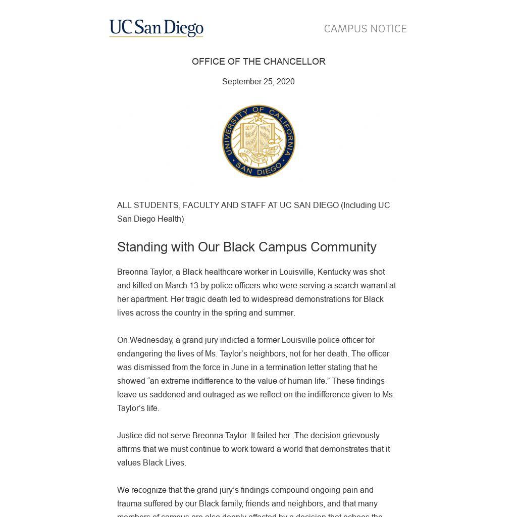 We recognize that the grand jury’s findings compound ongoing pain and trauma suffered by our Black family, friends and neighbors, and that many members of campus are also deeply affected by a decision that echoes the pervasive systemic anti-Black racism in America. We ask all Tritons to continue to stand in solidarity with our Black community members, to reach out and care for one another.
