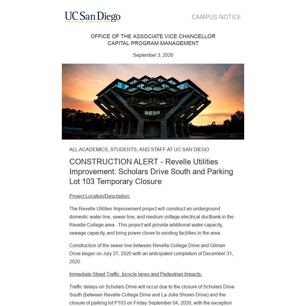 Traffic delays on Scholars Drive will occur due to the closure of Scholars Drive South (between Revelle College Drive and La Jolla Shores Drive) and the closure of parking lot P103 on Friday September 04, 2020, with the exception of access to the Housing Dining and Hospitality loading dock. Traffic will be controlled by flag persons and detour signs will be provided. Bike lane and pedestrian sidewalks on Scholars Drive South will also be closed at this section of Scholars Drive. Please follow signage and allow extra time while traveling along Scholars Drive South.