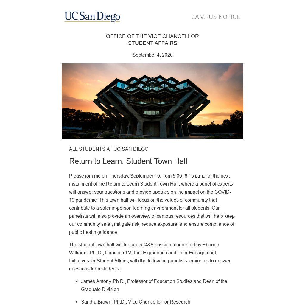 If you have any questions about the student town hall, please contact the Return to Learn program at rtl@ucsd.edu.