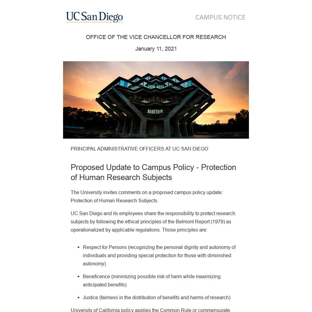 The University invites comments on a proposed campus policy update: Protection of Human Research Subjects.