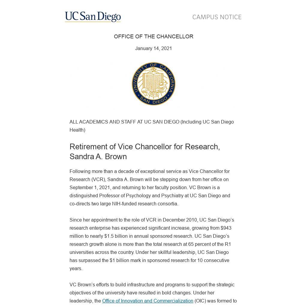 VC Brown has made a lasting impact during her tenure and leaves an enduring legacy that honors the past decade of research and positions UC San Diego well in its research enterprise for the next decade. Please join me in expressing sincere gratitude to VC Brown for her remarkable contributions to our university’s world-class research enterprise.
