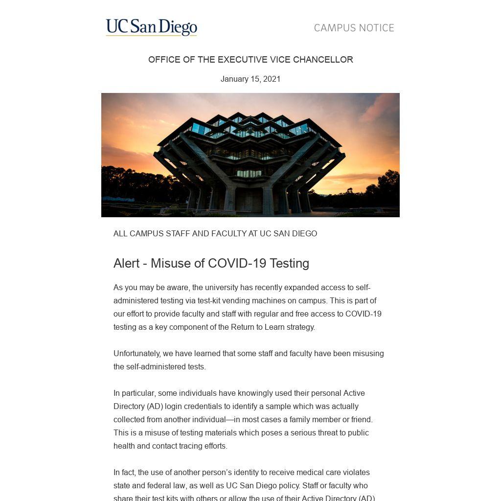 In fact, the use of another person’s identity to receive medical care violates state and federal law, as well as UC San Diego policy. Staff or faculty who share their test kits with others or allow the use of their Active Directory (AD) login credentials or identity for another individual to receive COVID-19 testing will be subject to applicable university disciplinary processes.