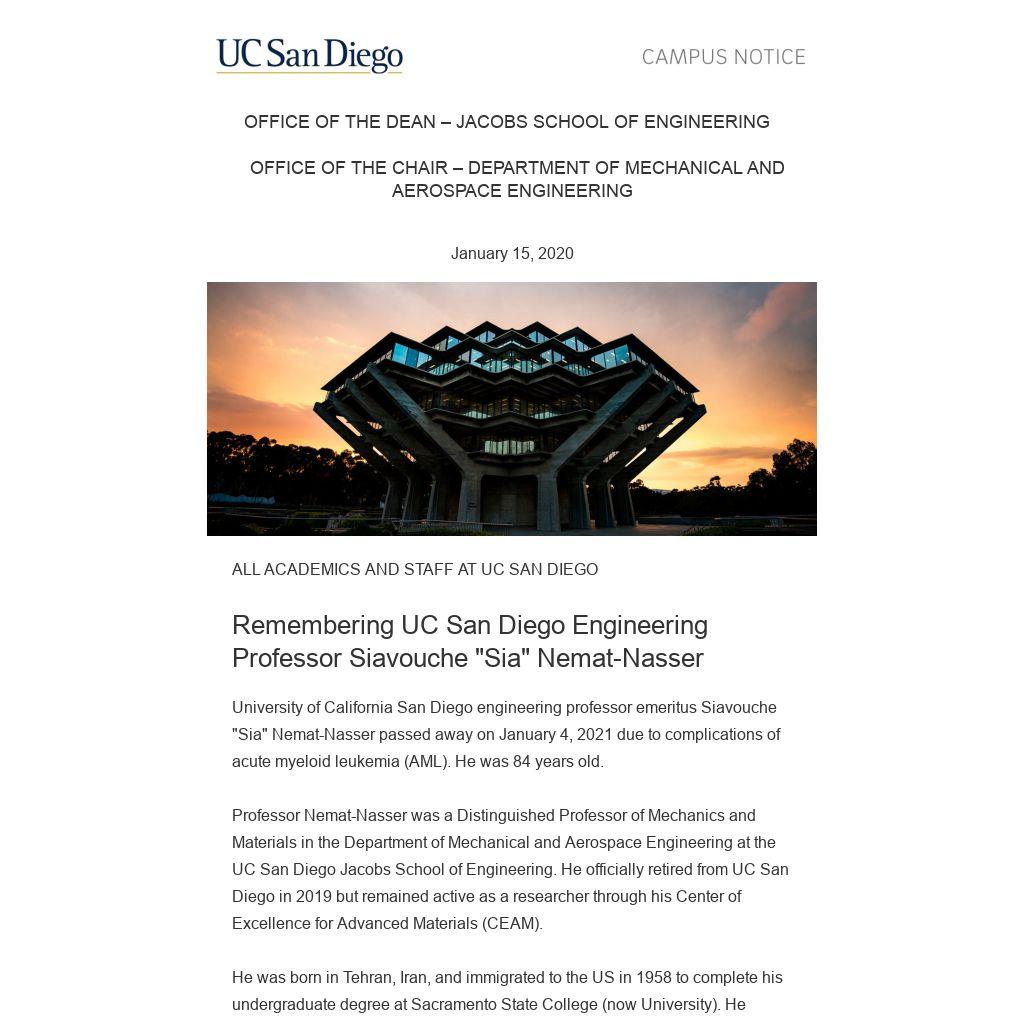 University of California San Diego engineering professor emeritus Siavouche "Sia" Nemat-Nasser passed away on January 4, 2021 due to complications of acute myeloid leukemia (AML). He was 84 years old.