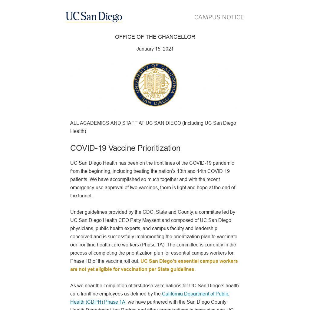 Under guidelines provided by the CDC, State and County, a committee led by UC San Diego Health CEO Patty Maysent and composed of UC San Diego physicians, public health experts, and campus faculty and leadership conceived and is successfully implementing the prioritization plan to vaccinate our frontline health care workers (Phase 1A). The committee is currently in the process of completing the prioritization plan for essential campus workers for Phase 1B of the vaccine roll out. UC San Diego’s essential campus workers are not yet eligible for vaccination per State guidelines.